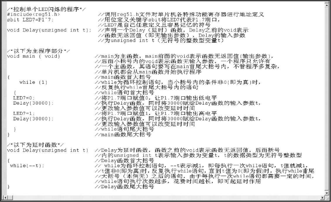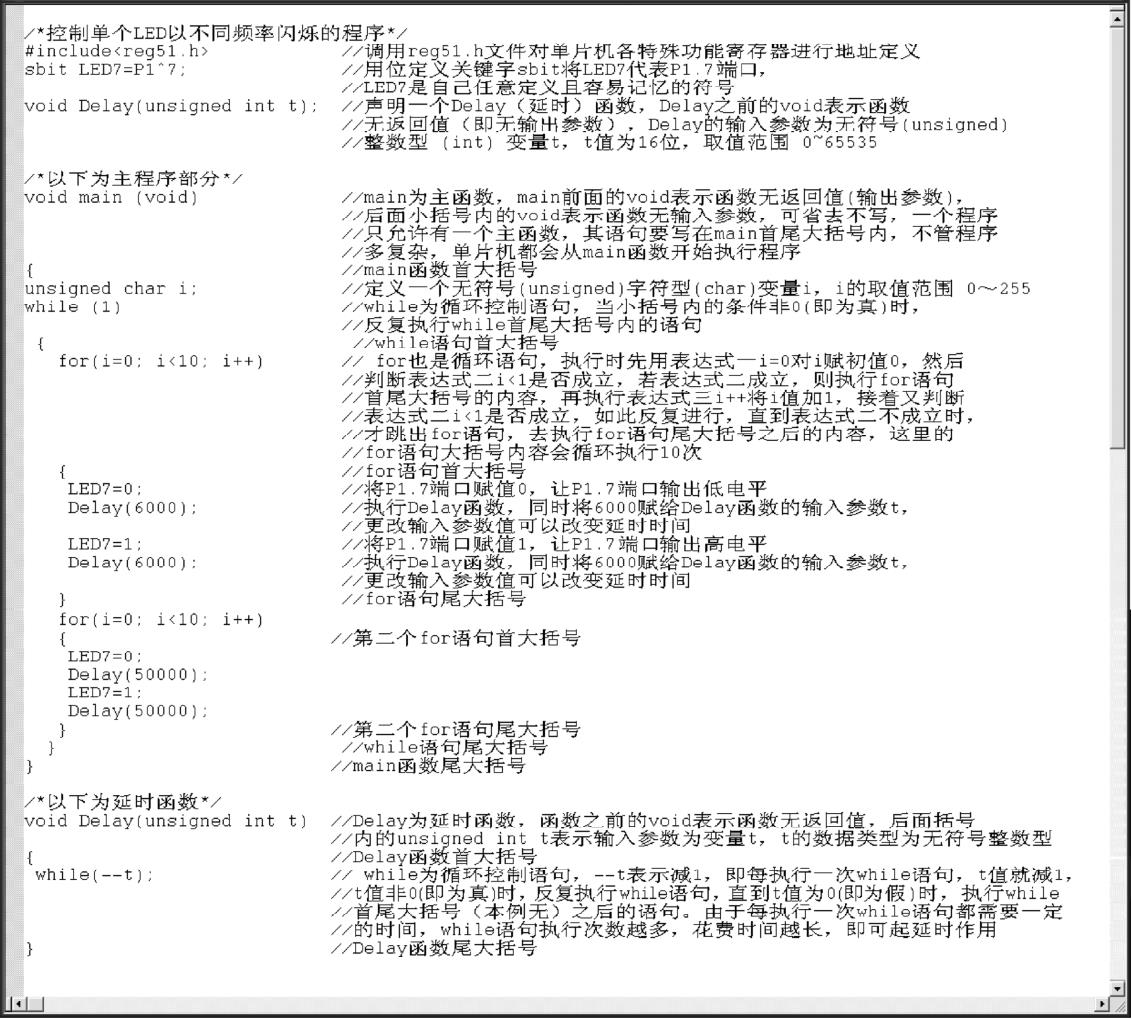 2)“//”为单行注释开始符号,注释内容写在该符号之后,换行自动结束注释。注释部分有助于阅读和理解程序,不会写入单片机,图4-7是去掉注释部分的程序,其功能与图4-6程序一样,只是阅读理解不方便。