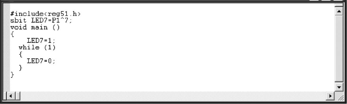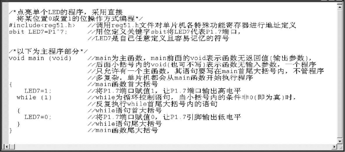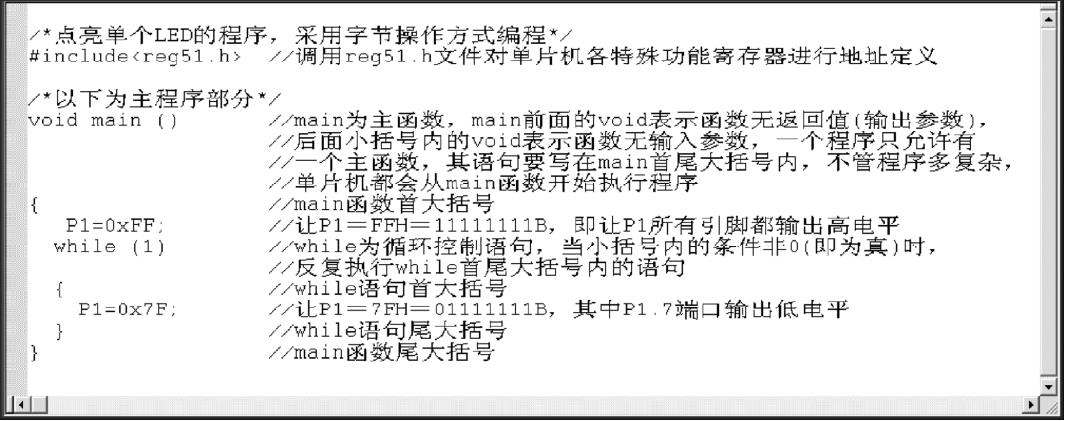 图4-6是用Keil C51软件编写的采用位操作方式点亮单个LED的程序。