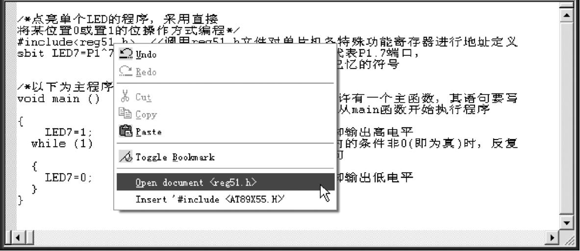 图4-8 在程序的reg51.h上单击鼠标右键用菜单打开该文件