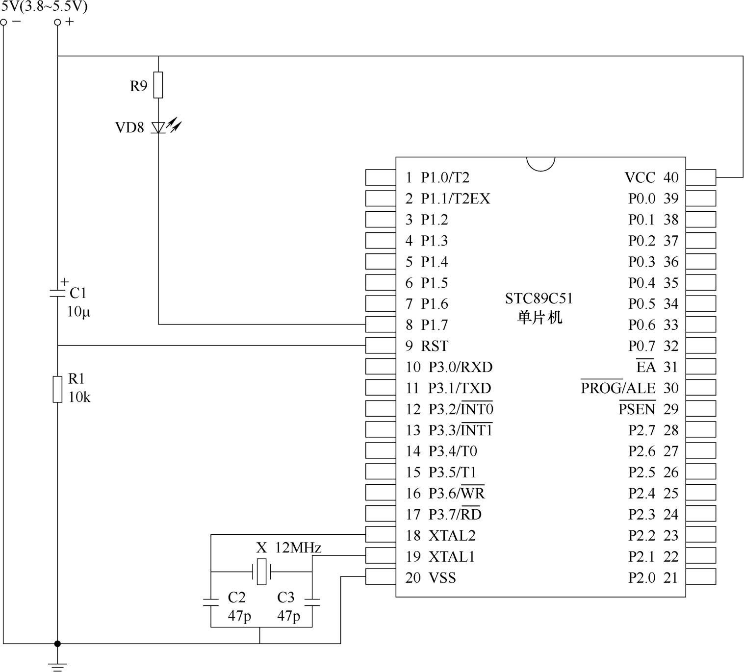 图4-5是单片机(STC89C51)点亮单个LED的电路,当单片机P1.7端口为低电平时,LED(发光二极管)VD8导通,有电流流过LED,LED点亮,此时LED的工作电流为 I F =( U-U F ) /R =(5-1.5)V/510Ω≈0.007A=7mA。