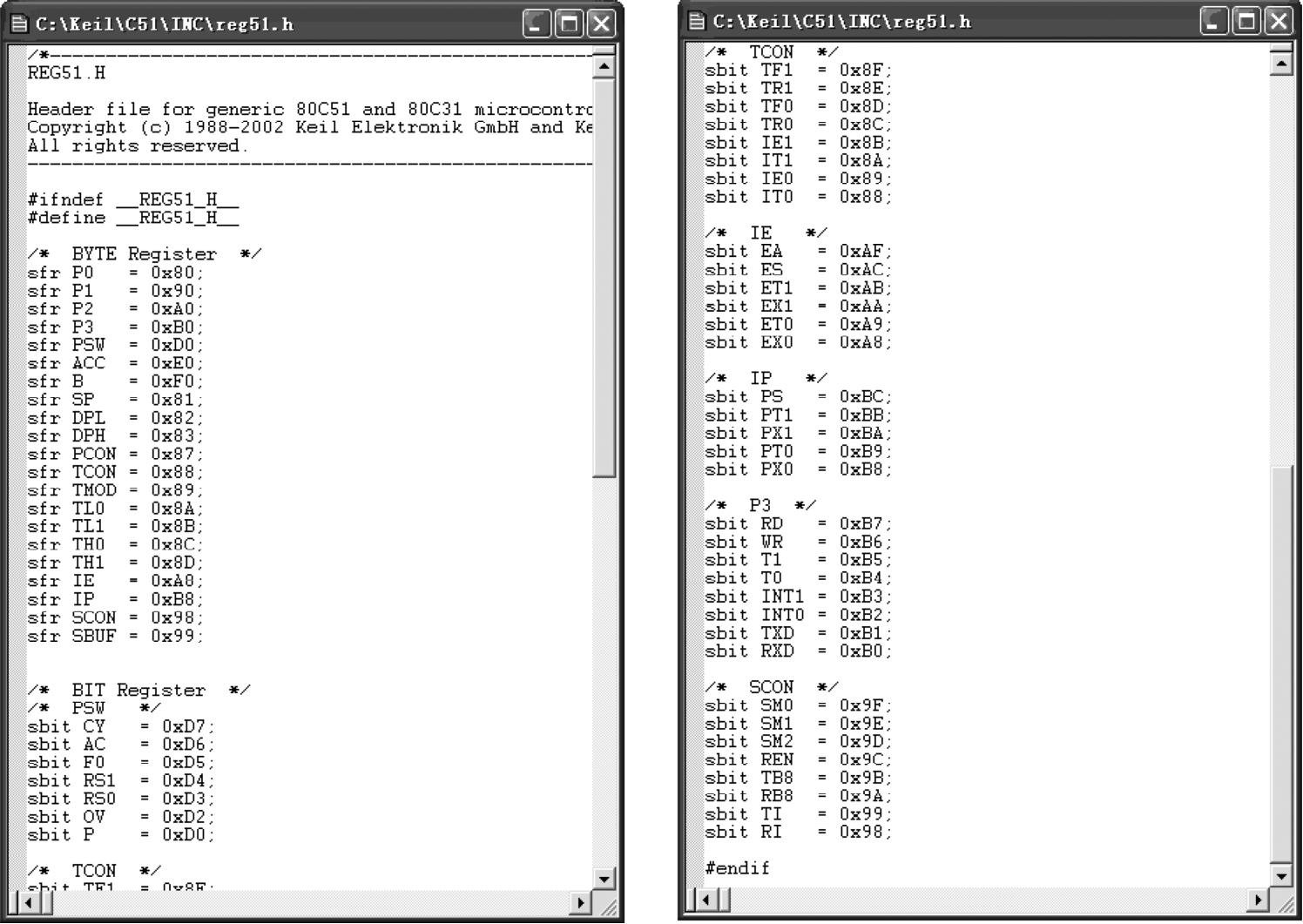 4)“reg51.h”是8051单片机的头文件,在程序的reg51.h上单击鼠标右键,将弹出图4-8所示的右键菜单,选择打开reg51.h文件,即可将reg51.h文件打开,reg51.h文件的内容如图4-9所示。它主要是定义8051单片机特殊功能寄存器的字节地址或位地址,如定义P0端口(P0锁存器)的字节地址为0x80(即80H),PSW寄存器的CY位的位地址为0xD7(即D7H)。reg51.h文件位于“C:\Keil\C51\INC”中。在程序中也可不写“#include<reg51.h>”,但需要将reg51.h文件中所有内容复制到程序中。