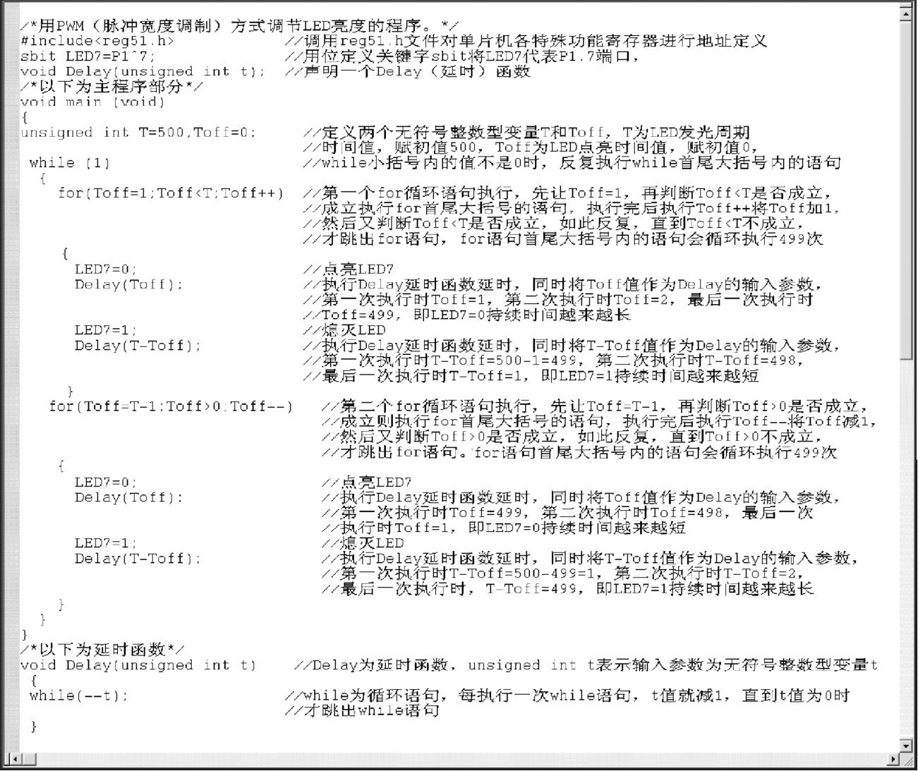 图4-25是采用PWM方式调节LED亮度的程序。程序执行后,单片机P1.7端口外接的LED先慢慢变亮,然后慢慢变暗。