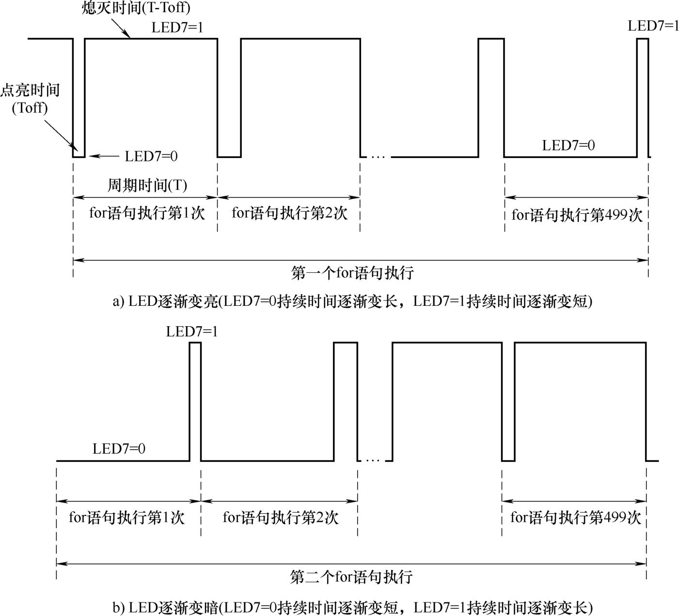 该程序中的第一个for语句会执行499次,每执行一次,P1.7端口输出的PWM脉冲变窄一些,如图4-24a所示,即LED7=0持续时间越来越长,LED7=1持续时间越来越短,LED越来越亮,在for语句执行第499次时,LED7=0持续时间最长,LED7=1持续时间最短,LED最亮。程序中的第二个for语句也会执行499次,每执行一次,P1.7端口输出的PWM脉冲变宽一些,如图4-24b所示,即LED7=0持续时间越来越短,LED7=1持续时间越来越长,LED越来越暗,在for语句执行第499次时,LED7=0持续时间最短,LED7=1持续时间最长,LED最暗。
