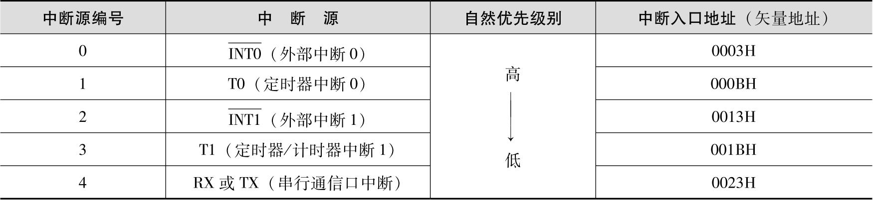 3)寻找中断入口地址。保护好断点后,CPU开始寻找中断入口地址(又称矢量地址),中断入口地址存放着相应的中断子程序,不同的中断源对应着不同的中断入口地址。8051单片机5个中断源对应的中断入口地址见表6-1。