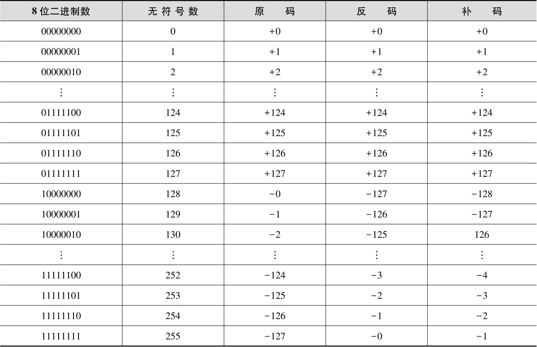 无符号数因为不用符号位,8位全部用来表示数据,所以这种方法可以表示的数据范围是0~255。8位二进制数的不同表示方式的换算关系见表2-1。