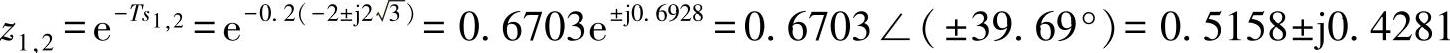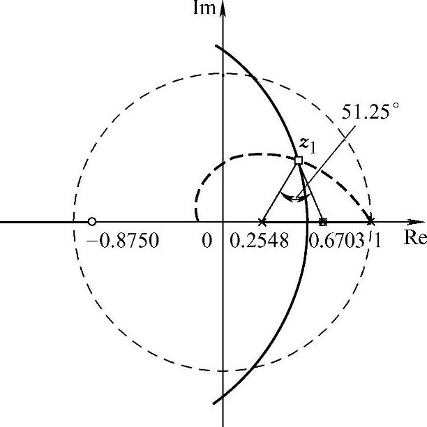 其零点( z =-0.875)和极点( z =1及 z =0.6703)在 z 平面上的分布如图8-30所示。为使校正后系统的根轨迹通过主导极点 z 1,2 (由于离散系统的零、极点分布和根轨迹曲线对称于实轴,因此选择 z 1 =0.5158+j0.4281进行下面的设计),根据相角条件可得数字控制器需要提供的相角为