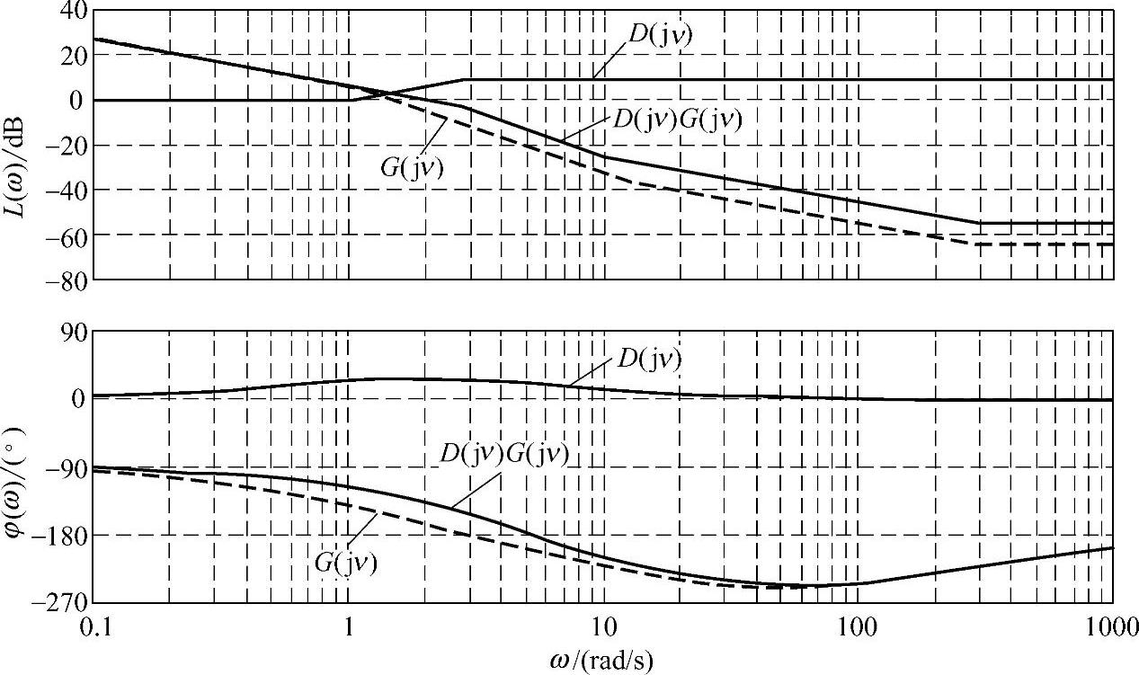 绘制校正后 D (j ν ) G (j ν )的伯德图如图8-33中的实线所示。由图可得,校正后系统的相位裕度为50 ° ,幅值裕度为14dB,满足性能指标要求。
