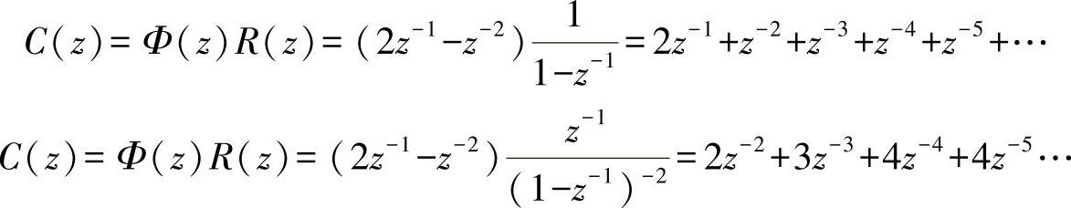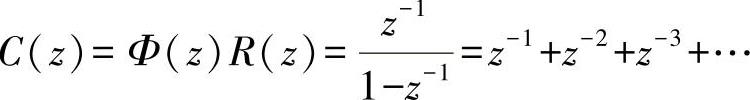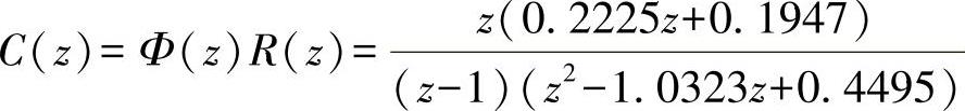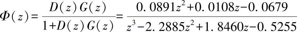 进行最少拍系统设计时,要求 Φ e ( z )的零点可以完全对消 R ( z )= z -1 /(1- z -1 )-2的极点,且 Φ e ( z )的零点 z =1正好可以补偿 G ( z )在单位圆上的极点 z =1,而 Φ ( z )已包含 G ( z )的传递函数延迟 z -1 ,满足最少拍系统设计的限制性要求。为使系统的输出无波纹,要求 Φ ( z )的零点应包含 G ( z )的全部零点,故选取