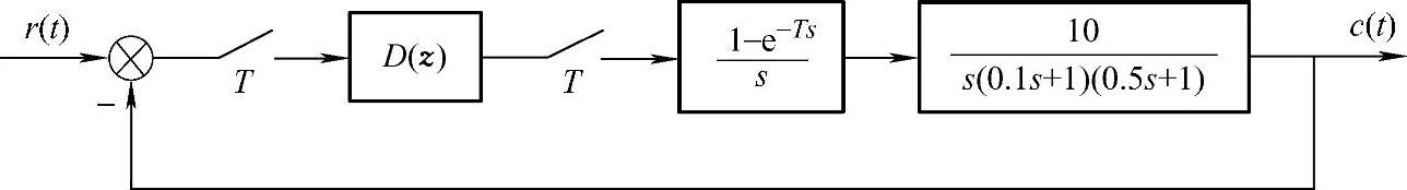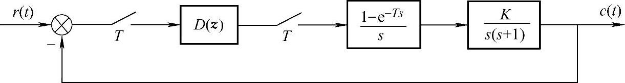 例8-24 设离散控制系统如图8-29所示,采样周期 T =0.2s。试设计一个数字控制器,使系统的阶跃响应具有下列性能指标:超调量为16.3%,调节时间为2s(取 Δ =2%)。并求综合后系统的单位阶跃响应和速度误差系数。