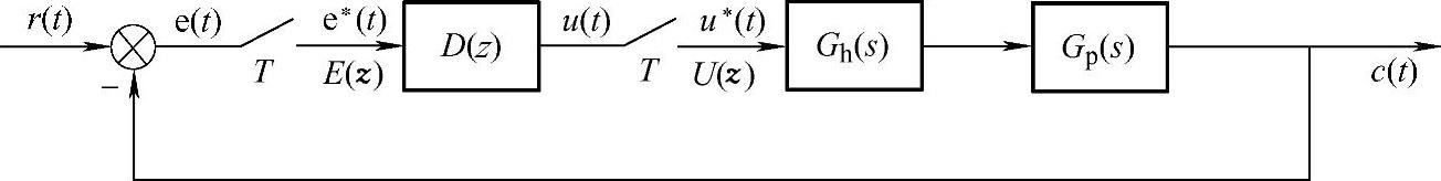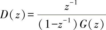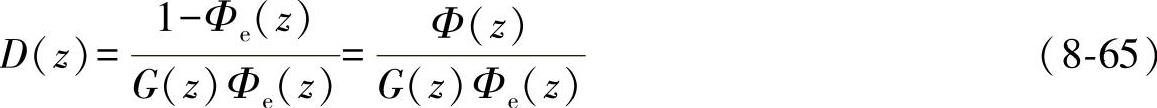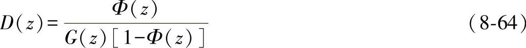 在上面的讨论中,没有讨论系统广义被控对象 G ( z )的稳定性。实际上,若 G ( z )的零极点均在 z 平面的单位圆内部,则由式(8-64)或式(8-65)确定的数字控制器 D ( z )就一定是稳定的。若 G ( z )含有 z 平面不在单位圆内部的零极点,则所确定的 D ( z )就含有这些零极点。从理论上说可以相互抵消,但实际上 G ( z )的不稳定零极点靠数字控制器来抵消是不允许的,这是由于不可避免的参数变化等原因而可能出现不能完全抵消的情况,况且 D ( z )中的不稳定极点会引起控制器的不稳定。因此,当 G ( z )含有不稳定的零极点时,由式(8-65)