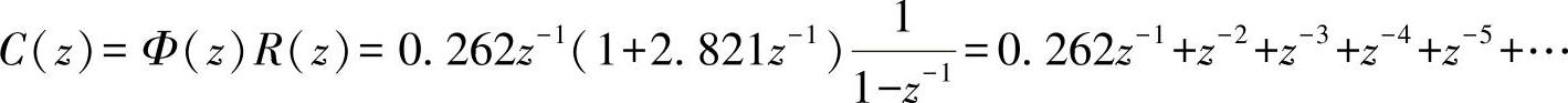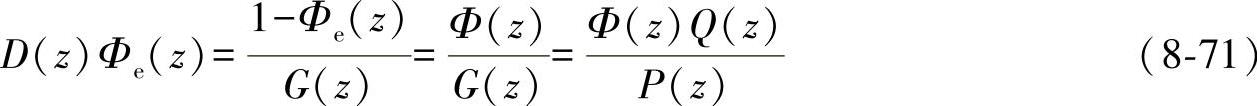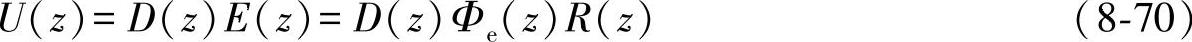 其中, P ( z )为 G ( z )的分子多项式; Q ( z )为 G ( z )的分母多项式。表8-7表明,进行最少拍系统设计时, Φ e ( z )的零点可以完全对消 R ( z )的极点。因此,式(8-70)表明,只要 D ( z ) Φ e ( z )为 z -1 的有限项多项式, U ( z )就是 z -1 的有限项多项式。在式(8-71)中, Q ( z )为 z -1 的有限项多项式,所以 D ( z ) Φ e ( z )成为 z -1 的有限项多项式的条件就是 Φ ( z ) /P ( z )为 z -1 的有限项多项式,也就是说,所设计的最少拍无波纹控制系统闭环脉冲传递函数 Φ ( z )的零点应包含系统广义对象脉冲传递函数 G ( z )的全部零点,即应有