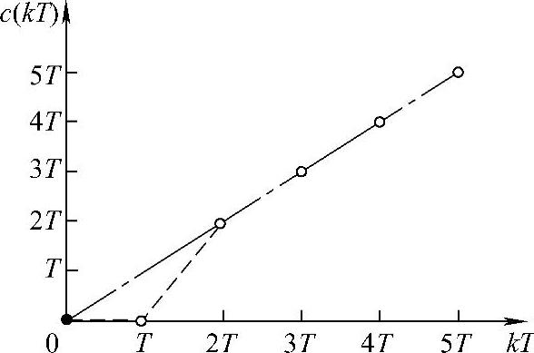 上述结果表明, c (0)= c ( T )=0, c (2 T )=2 T , c (3 T )=3 T ,…; e (0)=0, e ( T )= T , e (2 T )= e (3 T )=…=0。可见,最少拍系统经过二拍就可以完全跟踪给定输入信号 r ( t )= t ,二拍之后稳态误差为零,如图8-37所示。这样的离散系统称为二拍系统,其调节时间 t s =2 T 。