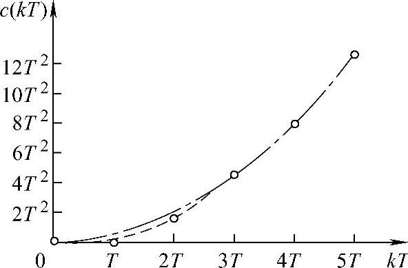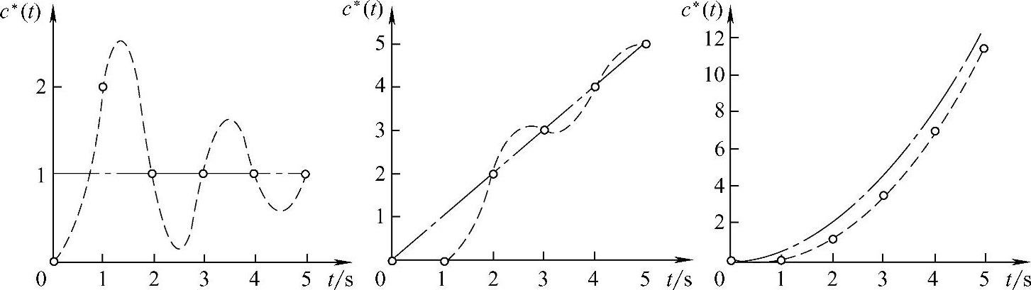 上述结果表明, c (0)= c ( T )=0, c (2 T )=1.5 T 2 , c (3 T )=4.5 T 2 , c (4 T )=8 T 2 ,…; e (0)=0, e ( T )= e (2 T )=0.5 T 2 , e (3 T )= e (4 T )=…=0。可见,最少拍系统经过三拍就可以完全跟踪给定输入信号 r ( t )= t 2 /2,三拍之后稳态误差为零,如图8-38所示。这样的离散系统称为三拍系统,其调节时间 t s =3 T 。