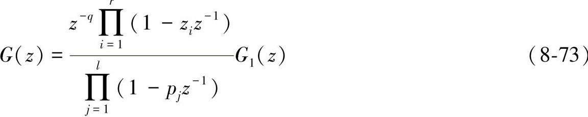 式中, z i ( i =1,2,…, r )为单位圆上或单位圆外的零点; p j ( j =1,2,…, l )为单位圆上或单位圆外的极点; z - q 表示 G ( z )中含有的延迟因子; G 1 ( z )为只含有单位圆内零极点的 z -1 多项式的有理分式。