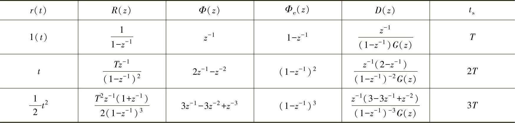 各种典型输入作用下最少拍系统的 Φ ( z )、 Φ e ( z )及 t s 列于表8-7中。