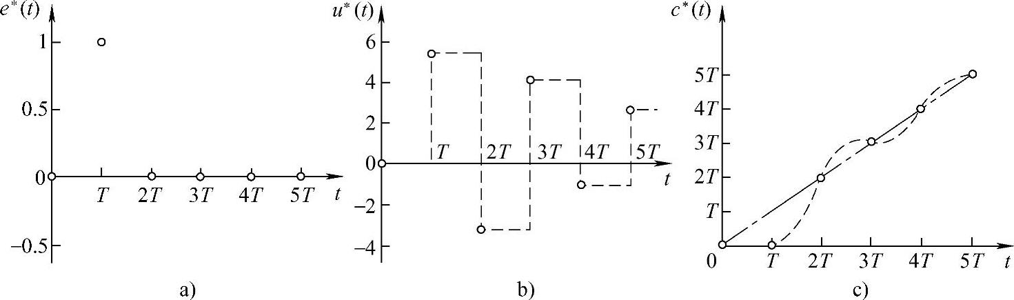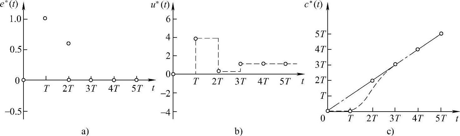 因此, u * ( t )的脉冲序列为 u (0)=0, u (1)=3.823, u (2)=0.172, u (3)= u (4)=…=0.998。数字控制器的输出信号 u * ( t )从第三拍起达到稳态,系统的输出无波纹。可以画出误差信号 e * ( t )、控制信号 u * ( t )和系统输出信号 c * ( t )的响应如图8-41所示。