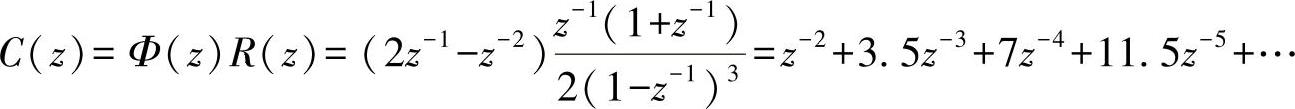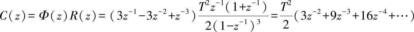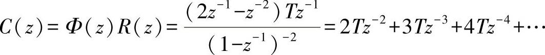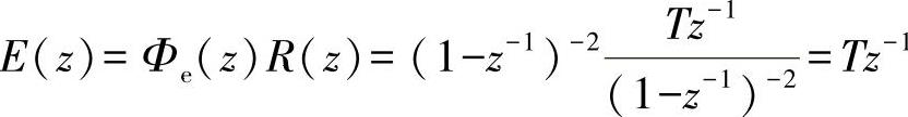 在例8-26中,当单位斜坡输入信号作用于已设计好的最少拍控制系统时,根据已确定的 Φ e ( z ),可以求得误差信号的 z 变换为