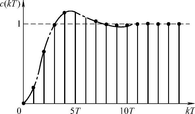 相应的单位阶跃响应序列如图8-34所示。单位阶跃响应曲线表明,超调量约为20%,调节时间约为4s。可见,在正弦振荡每个周期内的采样次数约为15,这表明采样频率 ω s 是阻尼振荡频率 ω d 的15倍。因此,采样周期 T =0.2s的选择是满意的,综合校正的结果是可行的。
