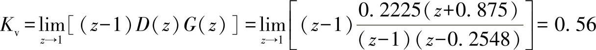 由式(8-65)可知, Φ e ( z )的零点 z =1正好可以补偿 G ( z )在单位圆上的极点 z =1;而 Φ ( z )已包含 G ( z )的传递函数延迟 z -1 。因此,上述 Φ ( z )和 Φ e ( z )满足对消 G ( z )中的传递延迟 z -1 及补偿 G ( z )在单位圆上极点 z =1的限制性要求,故按式(8-65)算出的 D ( z ),可以确保设计出的系统成为在 r ( t )= t 作用下为最少拍系统。根据给定的 G ( z )和查表选取的 Φ e ( z ),求得数字控制器的脉冲传递函数为