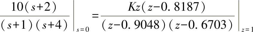 2)零极点匹配法。由于 G ( s )有一个无穷远处的零点,所以应给 G ( z )设置一个 z =0的零点。则