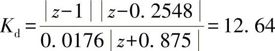 φ d =-180 ° -∠ G ( z 1 )=-180 ° -[∠( z 1 +0.875)-∠( z 1 -1)-∠( z 1 -0.6703)]=51.25 ° 因此,数字控制器需要提供超前相角51.25 ° 。