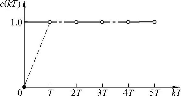 上述结果表明, c (0)=0, c ( T )= c (2 T )=…=1; e (0)=1, e ( T )= e (2 T )=…=0。可见,最少拍系统经过一拍就可以完全跟踪给定输入信号 r ( t )=1( t ),一拍之后稳态误差为零,如图8-36所示。这样的离散系统称为一拍系统,其调节时间 t s = T 。