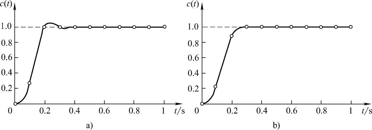 设计得到的最少拍控制系统和最少拍无波纹控制系统如图8-44a、b所示,图中实线表示被控对象的输出,小圆圈表示采样时刻的值。在图8-44a中,经过两个采样周期,实现在采样时刻无稳态误差,但在采样时刻之间有波纹存在。在图8-44b中,经过三个采样周期,实现了在采样时刻无稳态误差,且在采样时刻之间无波纹存在。