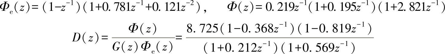 按照性能指标要求,合适地选取 M ( z )和 F ( z )的阶,根据式(8-66)的关系式可解得 M ( z )和 F ( z )的待定系数。按式(8-65)确定数字控制器 D ( z )的脉冲传递函数,当 D ( z )的分母多项式的阶次大于或等于其分子多项式的阶次时,所设计的数字控制器 D ( z )是可以物理实现的。