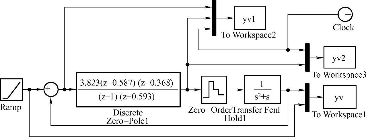 SIMULINK仿真模型fig841.mdl如图8-42所示。在仿真模型中,设置离散零极点模型、零阶保持器以及变量yv1的采样时间为1s,其他模块的采样时间和仿真时间相同。