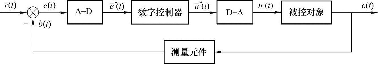 早期的离散控制系统为采样控制系统,控制装置大多还属于模拟控制装置,控制功能和控制精度均受到限制。在数字控制系统中,数字控制器基本取代了模拟控制器,控制器的功能和控制精度大大提高。数字控制系统是一种用数字计算机作为控制器去控制具有连续工作状态的被控对象的控制系统,包括工作于离散状态下的数字控制器和工作于连续状态下的被控对象两大部分。数字控制系统的典型原理如图8-1所示。