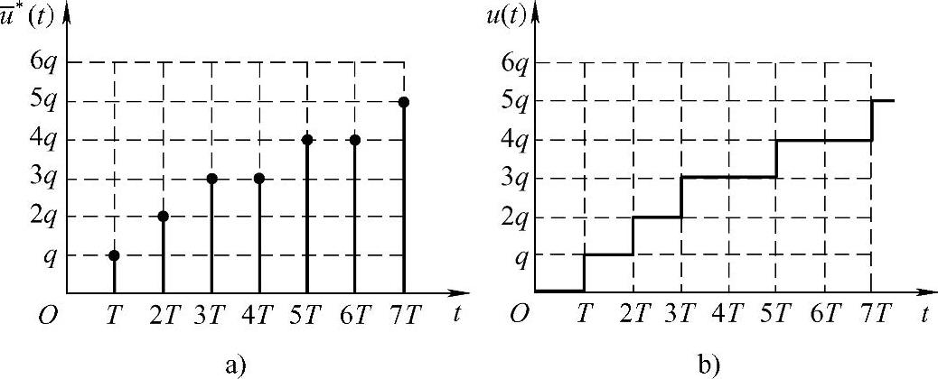 )才能用来控制连续的被控对象,如图8-3b所示。通常的办法是通过D-A转换器中的寄存器存储数字信号,使其在每个采样周期内保持为常值,并经D-A转换器中的解码网络将这一数字信号变成模拟信号。经D-A转换后得到的模拟信号