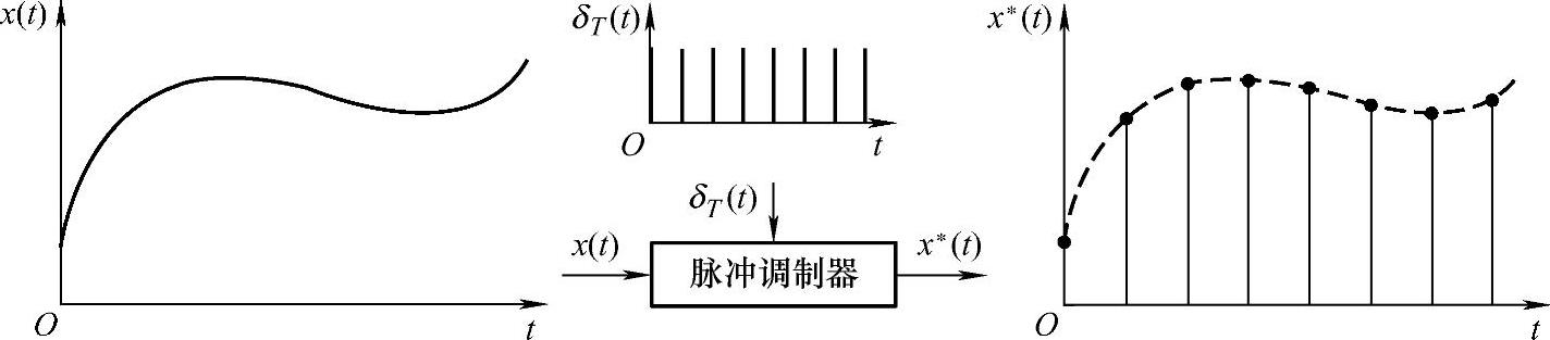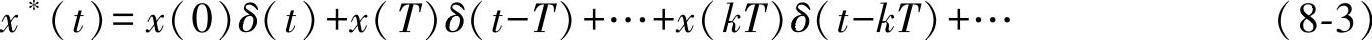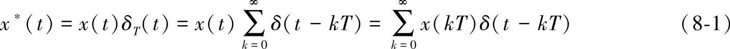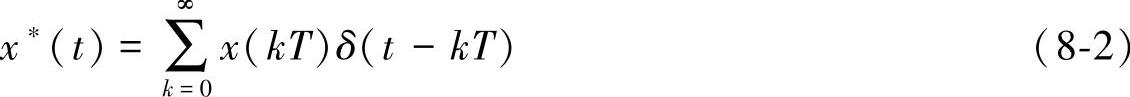 考虑到采样开关的闭合时间 τ 远远小于采样周期 T ,即 τ << T ,在分析时可以认为 τ ≈0。这样,采样器就可以用一个理想采样器来代替。理想采样器等效为一个脉冲调制器,采样器的输入信号 x ( t )为调制信号。采样过程可以看成是一个载波信号为理想单位脉冲序列 δ T ( t )的脉冲调制过程,采样器的输出信号 x ∗ ( t )为理想脉冲序列,如图8-6所示。