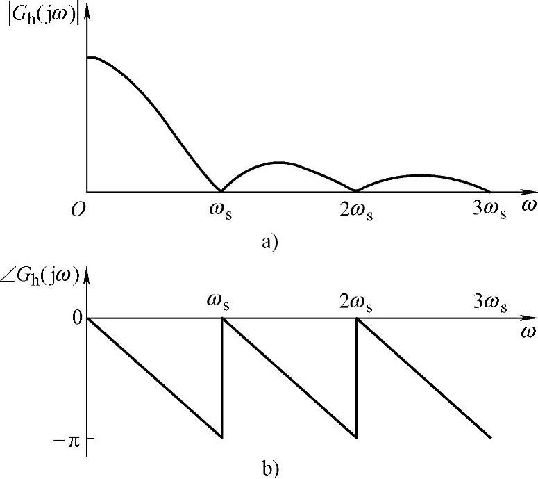 根据式(8-12),可画出零阶保持器的幅频特性| G h (j ω )|和相频特性∠ G h (j ω ),如图8-9所示。图中, ω s =2π /T 为采样角频率。