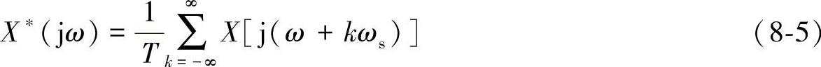 一般说来,连续信号 x ( t )的频谱| X (j ω )|是单一的连续频谱,其频带宽度是有限的,最高角频率为 ω h ,如图8-7a所示。而式(8-5)表明,采样信号 x ∗ ( t )的频谱| X ∗ (j ω )|则是以采样角频率 ω s 为周期的无穷多个频谱的叠加,如图8-7b和8-7c所示。在图8-7b中, k =0时的频谱| X (j ω )| /T 称为采样信号 x ∗ ( t )的主频谱; k =±1,±2,…时的频谱| X [j( ω + kω s )]| /T 都是由于采样而引起的高频频谱。根据采样角频率 ω s 的大小,频谱曲线| X ∗ (j ω )|可能出现两种情况:当 ω s ≥2 ω h 时,采样信号的主频谱和高频频谱彼此不混叠,如图8-7b所示,可以用一个理想低通滤波器(其频谱如图8-7b中虚线所示)滤掉全部附加的高频频谱分量,从而获得与连续信号 x ( t )的频谱| X (j ω )|成比例的主频谱| X (j ω )| /T ,使得有可能由采样信号 x ∗ ( t )无失真地复现连续信号 x ( t );当 ω s <2 ω h 时,采样信号的各频谱分量发生频率混叠,如图8-7c所示,即使用理想滤波器也无法将主频谱分离出来,因而就难以准确复现原有的连续信号。