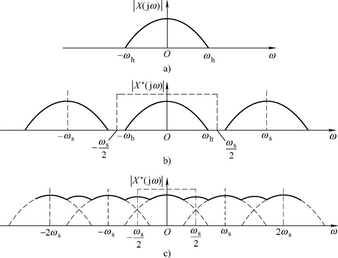a)连续信号的频谱 b) ω s >2 ω h 离散信号的频谱 c) ω s <2 ω h 离散信号的频谱