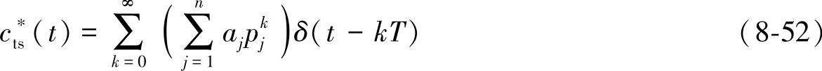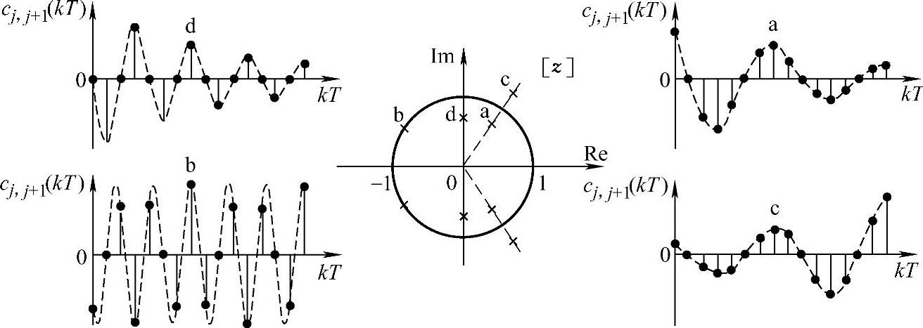 6)若 p j <-1,闭环极点位于 z 平面上单位圆外的负实轴上,瞬态响应是正负交替振荡的发散脉冲序列,振荡频率为采样频率的一半。