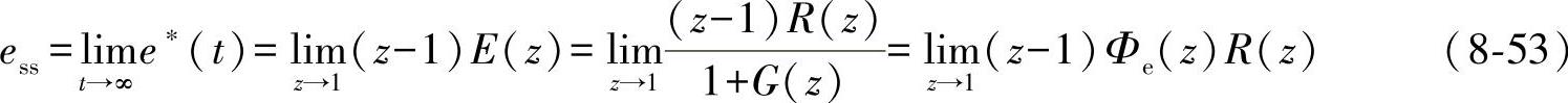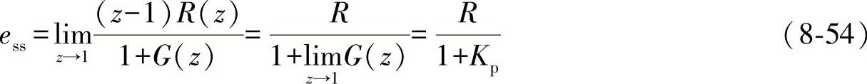 当给定输入信号为阶跃函数 r ( t )= R ·1( t )时,有 R ( z )= Rz/ ( z -1),由式(8-53)得到系统的稳态误差为