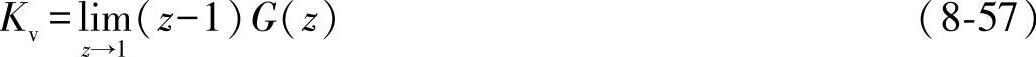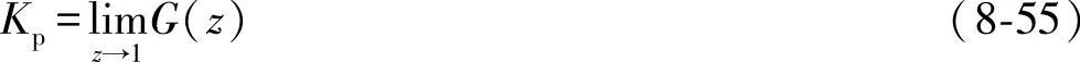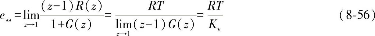 称为离散系统的静态位置误差系数。对于0型离散系统, G ( z )没有 z =1的极点,由式(8-55)可知 K p 为有限值,则由式(8-54)可计算系统的稳态位置误差且为有限值;对于Ⅰ型或Ⅰ型以上的离散系统, G ( z )有一个或一个以上 z =1的极点,由式(8-55)可得 K p =∞,则由式(8-54)可计算出系统的稳态误差 e ss =0,即在阶跃函数作用下离散系统没有稳态误差。