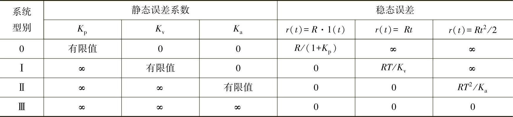 由 z 变换算子 z =e Ts 可知,如果开环传递函数 G ( s )有一个 s =0的极点,即一个积分环节,则与 G ( s )相应的 G ( z )必有一个 z =1的极点。在连续系统中,把开环传递函数 G ( s )具有 s =0的极点个数作为划分系统型别的标准。因此,在离散系统中,也可以把开环脉冲传递函数 G ( z )具有 z =1的极点个数 ν ,作为划分离散系统型别的标准。类似地,把 G ( z )中 ν =0,1,2,…的系统,称为0型、Ⅰ型、Ⅱ型…离散系统等。