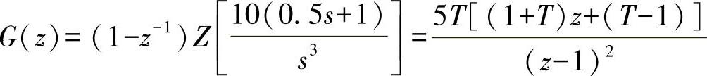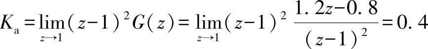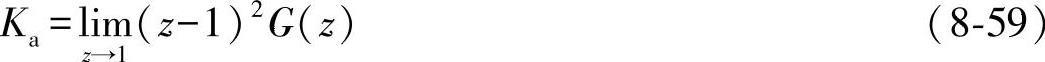 称为离散系统的静态加速度误差系数。由式(8-58)和式(8-59)可分析不同型别的离散系统在加速度函数输入作用下的稳态误差。对于0型和Ⅰ型离散系统, K a =0,求得 e ss =∞;对于Ⅱ型离散系统, K a 为有限值,由式(8-58)可计算系统的稳态位置误差 e ss 且为有限值;对于Ⅲ型或Ⅲ型以上的离散系统,可得 K a =∞,则系统的稳态误差 e ss =0,即在加速度函数作用下离散系统没有稳态误差。