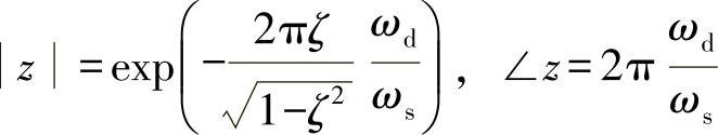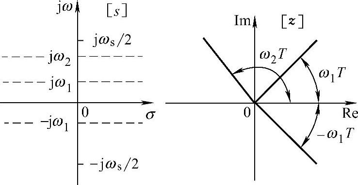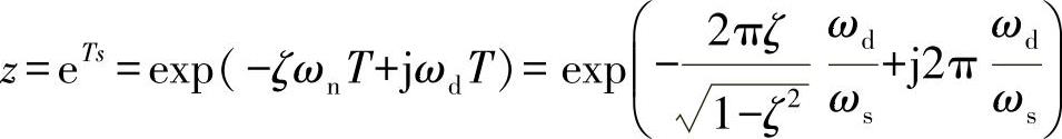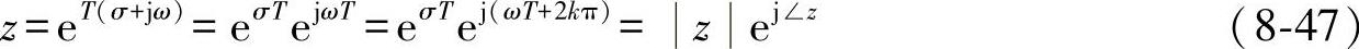 式中,| z |=e σ T 为 z 的模;∠ z = ωT 为 z 的相角。由式(8-47)可知, s 平面上频率相差为采样角频率 ω s =2π /T 整数倍的零、极点映射到 z 平面上的同一位置。这表明,每一个 z 值对应着无限多个 s 值。