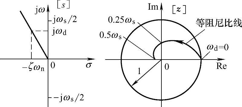 因此,当 ω d 增加时, z 的幅值减小而 z 的相角随 ω d 线性增加,左半 s 平面上的等阻尼比( ζ 为常数)线映射为 z 平面上单位圆内一簇收敛的对数螺旋线。图8-21所示为 ζ =0.5的一条等阻尼比线,当 ω d 从0变化到 ω s /4再变化到 ω s /2时, z 平面上的点从正实轴上 z =1的点变化到虚轴上的点再变化到负实轴上的点。