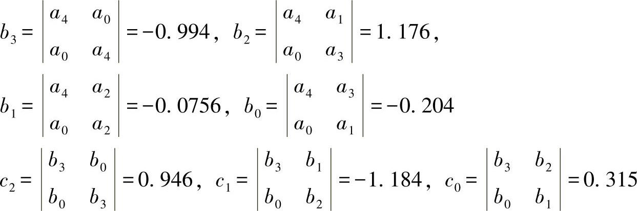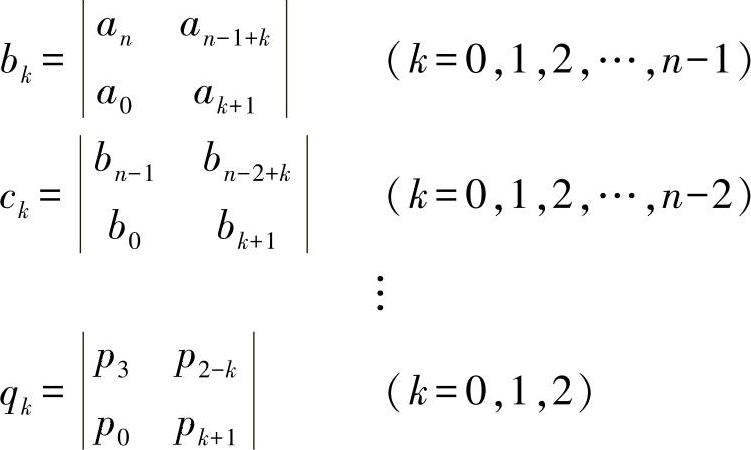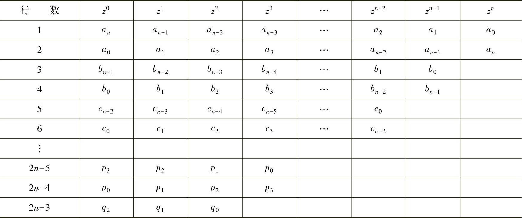 应当注意,表中最后一行由三个元素组成(对于二阶系统,2 n -3=1,因而朱利阵列表只有由三个元素构成的一行)。任一偶数行的元素只是前一奇数行的元素的逆序排列。