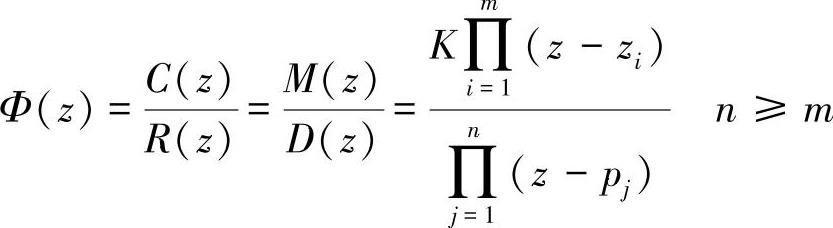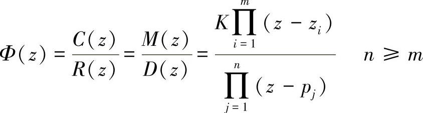 式中, M ( z )为分子多项式,其阶数为 m ; D ( z )为分母多项式,又叫特征多项式,其阶数为 n ; M ( z )=0的根 z i ( i =1,2,…, m )为系统的闭环零点; D ( z )=0为闭环系统的特征方程,它的根 p j ( j =1,2,…, n )为系统的特征根,即系统的闭环极点。