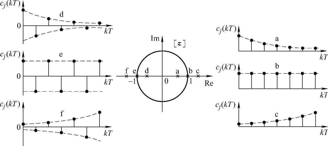 综上所述,离散系统闭环极点在 z 平面上的位置决定相应动态响应分量的性质和特点。当闭环极点位于 z 平面的单位圆内时,离散系统稳定,相应动态响应分量为衰减的脉冲序列,而且极点越靠近原点,衰减越快。当闭环极点位于 z 平面的左半单位圆内时,由于输出衰减脉冲序列高频振荡甚至正负交替振荡,故动态响应的性能欠佳。为了使线性时不变离散控制系统具有比较满意的动态性能,在离散控制系统设计时,应将闭环极点配置在 z 平面的右半单位圆内,尽量靠近坐标原点且闭环极点的相角要适中。当闭环极点位于 z 平面的单位圆外时,相应动态响应分量是发散的,这就意味着闭环离散控制系统不稳定。