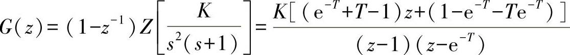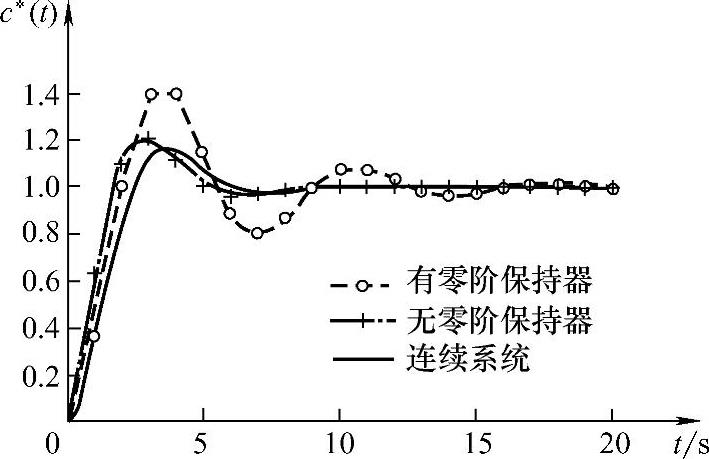 图8-26同时绘出了相应无零阶保持器时离散系统的单位阶跃响应序列(图中“+”所示)和连续系统的单位阶跃响应(图中实线所示)。可以看出,在相同条件下,由于采样损失了信息,与连续系统相比,离散系统的动态性能会有所降低。由于零阶保持器相当于延迟半拍的延迟环节,所以相对于无零阶保持器的离散系统,理论上其相位裕度会降低,稳定程度和动态性能会变差。但在实际系统中,用脉冲序列直接驱动被控对象是不合适的,一般都要经过零阶保持器,用连续的模拟量控制被控对象。