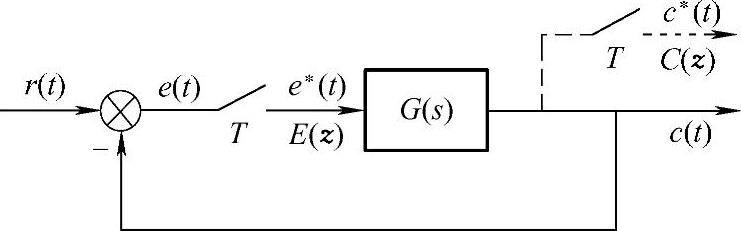 由于离散控制系统没有唯一的典型结构图形式,所以无法给出误差脉冲传递函数 Φ e ( z )的一般计算公式。设单位反馈离散控制系统如图8-27所示,可以求得系统的误差采样信号的 z 变换为