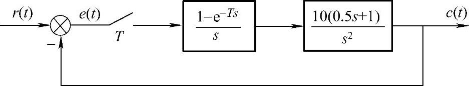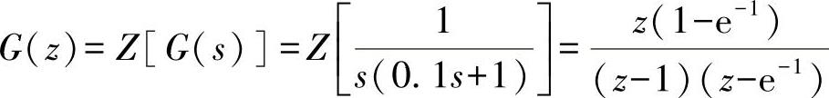 例8-21 设离散控制系统如图8-27所示,其中 G ( s )=1/[ s (0.1 s +1)],采样周期 T =0.1s,输入连续信号 r ( t )分别为1( t )和 t ,试求离散控制系统的稳态误差。