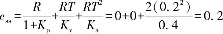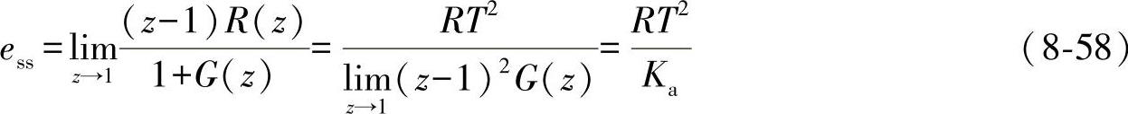当给定输入信号为加速度函数 r ( t )= Rt 2 /2时,有 R ( z )= RT 2 z ( z +1)/[2( z -1) 3 ],由式(8-53)得系统的稳态误差