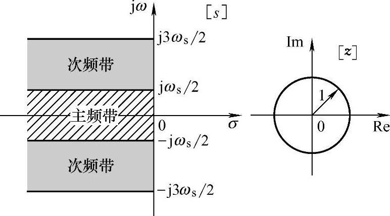 在离散系统中,根据采样定理,如果采样频率大于连续信号最高频率的两倍,表明连续信号的频率范围在主频带之内,则 z 平面单位圆内的点对应左半 s 平面上主频带内的点。因此,在分析和设计系统时,只考虑主频带就可以了。